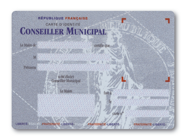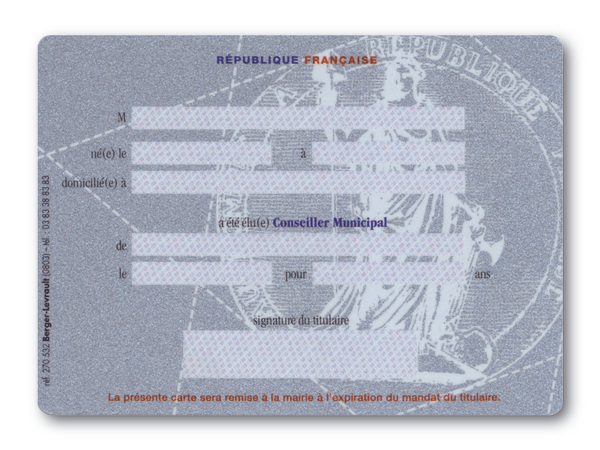 Fond gris métallisé avec, en filigrane, la première représentation de la République, rehaussé par la mention "Conseiller municipal" en dorure à chaud Bleu marine.