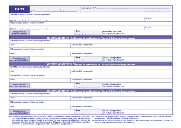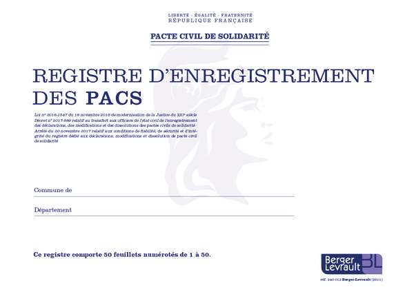 Registre conforme à l'arrêté du 20 novembre 2017 et à la circulaire de présentation dédiée aux pactes civils de solidarité du 13 décembre 2017.